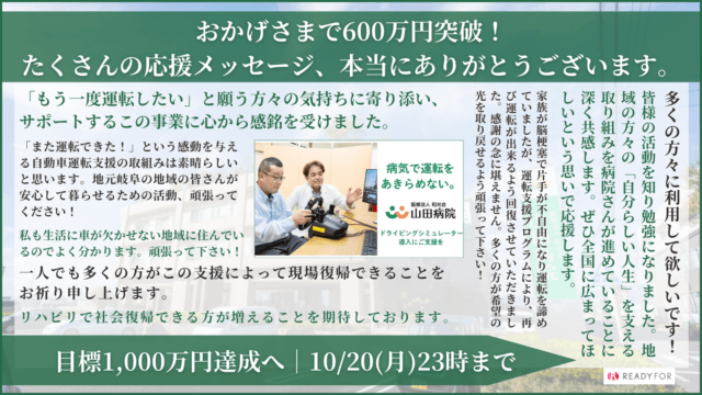 皆様の温かいご支援のおかげで【600万円】を達成することができました。病気や障がいを理由に運転をあきらめかけていた方々、そしてそのご家族に、もう一度希望の光を届けるための大きな一歩となります。