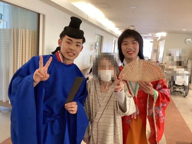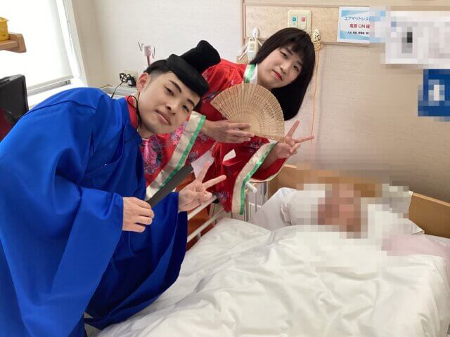 普段は静かに過ごされている患者さんも、華やかな衣装をご覧になると表情が和らぎ、「きれいだね」「写真を撮りたい」といった声が聞かれるなど、楽しいひとときを共有することができました。